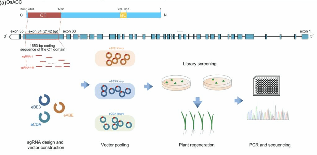 直播是水稻轻简栽培中最简化的种植方式,但是直播稻田杂草及杂草稻大量发生,极大限制了直播稻的发展。开发抗除草剂种质材料为稻田杂草防控提供了新的解决方案,对规模化作物生产极为重要。ACCase(乙酰辅酶A羧化酶)是芳氧苯氧丙酸(APP)类与环己烯二酮(CHD)类等多种重要商业除草剂的作用位点。许多杂草中,ACCase中羧基转移酶结构域(Carboxyltransferase, CT domain)中某些氨基酸的替换可赋予植物除草剂抗性。为挖掘水稻OsACC抗性位点,创制抗性材料,该研究针对编码OsACC CT domain的1653bp序列设计了141条sgRNA(NGG PAM),结合该研究组前期创制的两个高效保真CBE工具(eBE3和eCDA,(Qin et al., 2019))或按照已报道思路优化了前期构建的ABE工具(eABE)(Li et al., 2018; Li et al., 2019),分别构建了三个碱基编辑文库(下图)。理论上,编辑文库的窗口可对CT domain超1/3的序列实现覆盖(对eABE,窗口覆盖611-nt,含167可编辑的A和162 T;对eBE3,窗口覆盖788-nt,含165可编辑的C和192 G;对eCDA,窗口覆盖393-nt,含84可编辑的C和92 G)。在粳稻品种肥粳2020中分别导入三个文库,每文库取5000个转化愈伤在除草剂压力下筛选和分化4~8周后检测所获除草剂抗性事件。eABE文库共获25个抗性事件,除了一株植物携带I1879V替换外,其他多为前期已报道的C2186R突变(Li et al., 2018);eBE3文库所获三个抗性事件均携带W2125S突变;而eCDA文库并未获得抗性事件。进一步结果表明,I1879V突变在水稻正常生命周期中没有体现明显的负面效应,可能相对较适于进一步的性状改良,