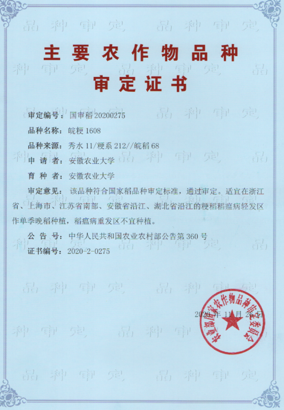 本网讯 农学院育成高产、广适、优质国审水稻新品种--皖粳1608。