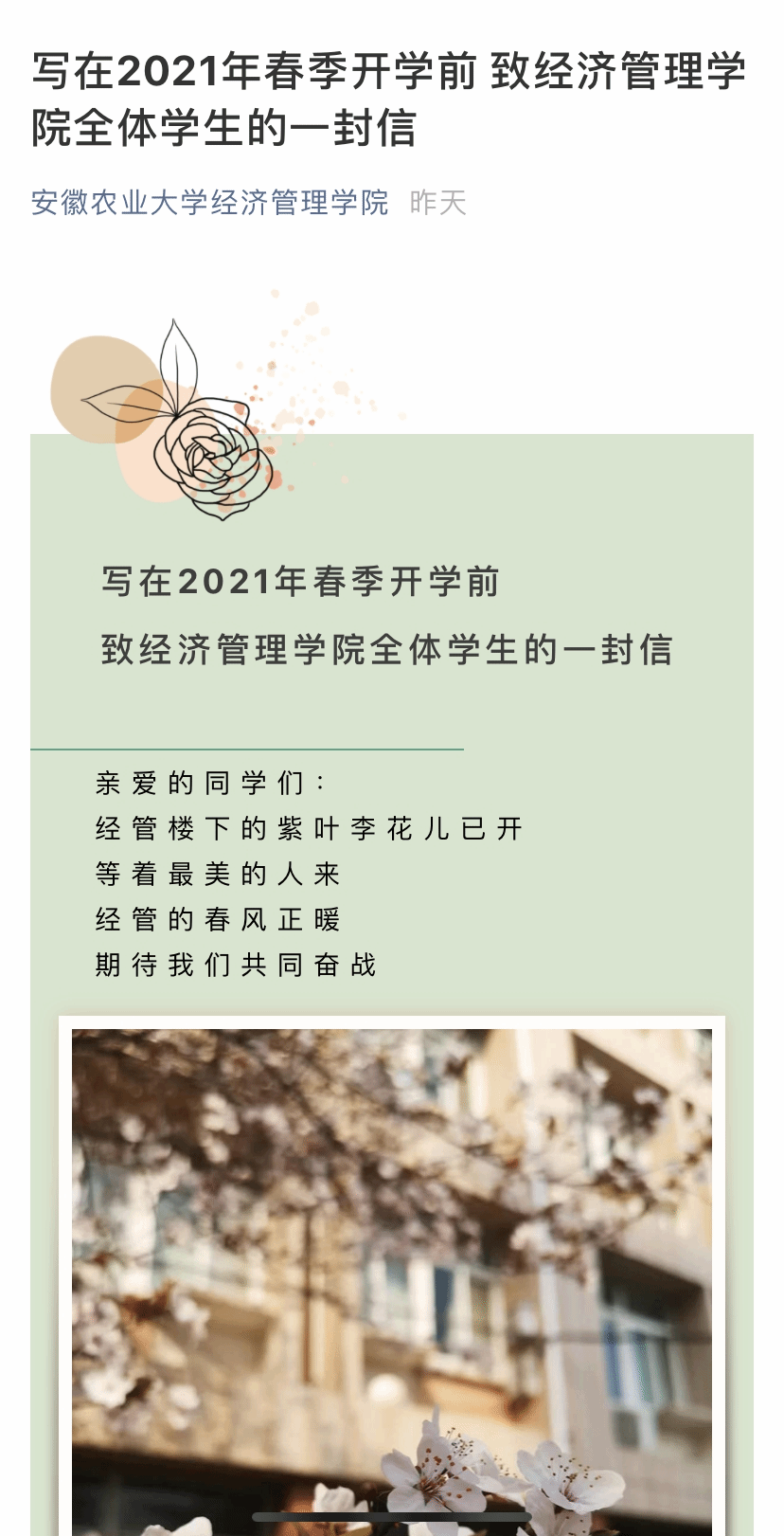 相关老师也就近期就业、团学等日常工作进行了安排。此外,学院还专门发布了《写在2021年春季开学前 致经济管理学院全体学生的一封信》 ,期望同学们能够发扬新时代的“三牛精神”,以只争朝夕的拼劲、不负韶华的闯劲,相约经管,续写2021新篇章。(沈泽阳通讯员:杨金丹)