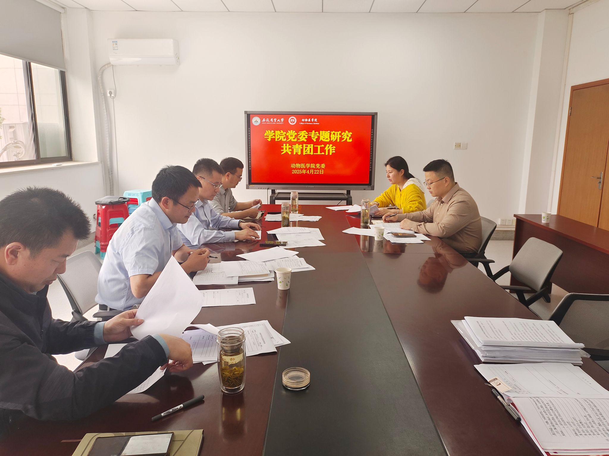本网讯 4月22日上午,动物医学院召开党委会专题研究共青团工作,学院领导班子、党委委员参加会议。会议由学院党委书记吴永红主持。