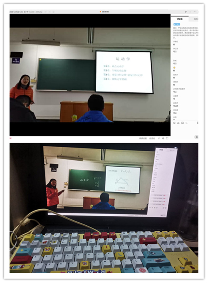 线下线上同步。为保障疫情防控要求下教学效果不打折,应用物理系创新教学方式,采取线下线上同步直播的方式开展教学。开学前授课教师就在“学习通”“雨课堂”平台《基础物理I》的线上课程里导入了学生名单,并提前发出课程通知,及时联系到学生建立了课程学习交流的班级QQ。为保障上课方式的顺利开展,应用物理系的曹春斌、周爱毓、周倩等老师上周就走进了教室,从直播设备、线上课堂图像、声音效果,黑板板书、网络流量等方面做了多次测试,并及时跟学生沟通了线下线上课堂的效果。3月8日开学第一天,周爱毓和周倩老师的线下线上同步直播教学模式实践一切顺利,学生反馈教学效果好。