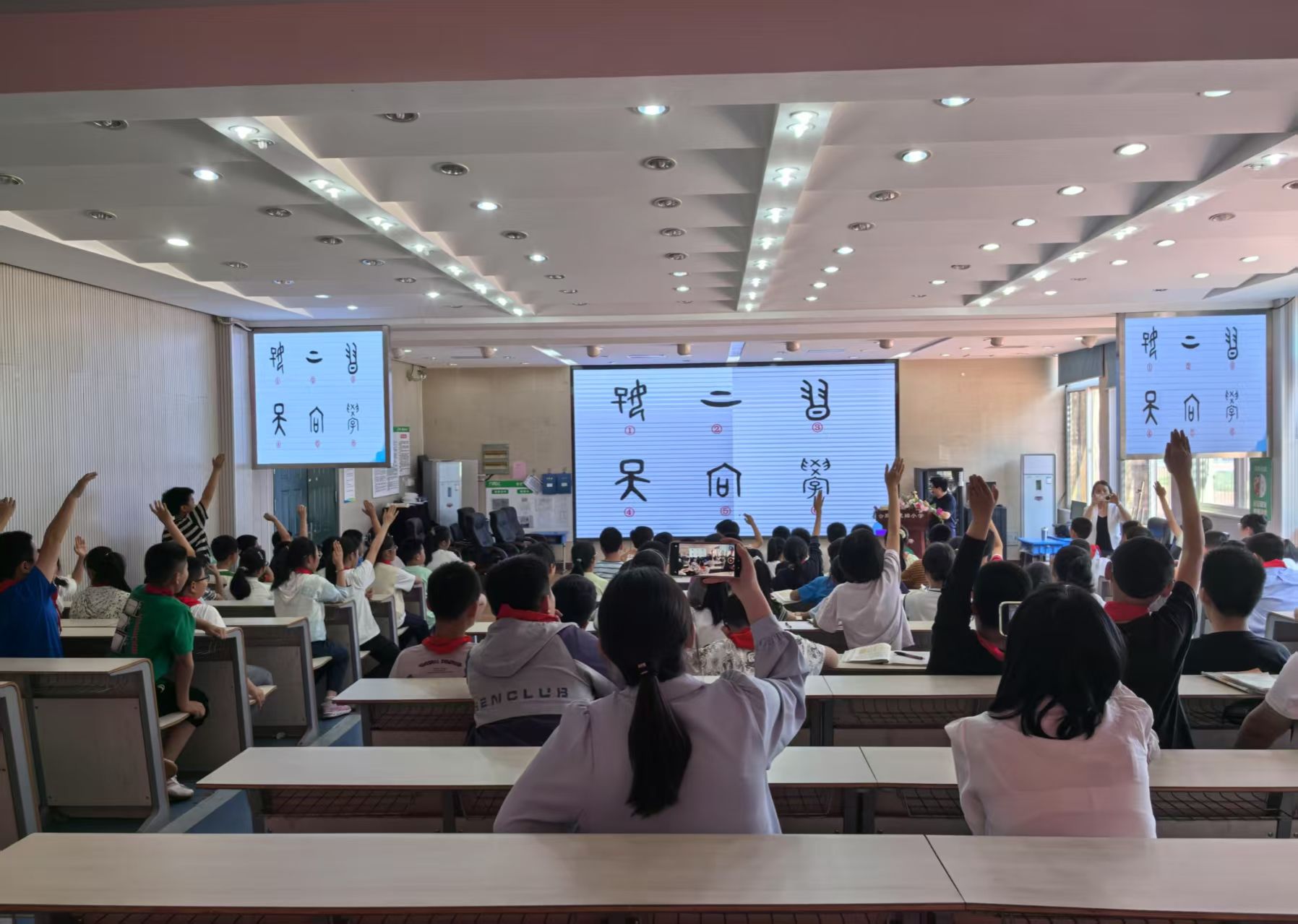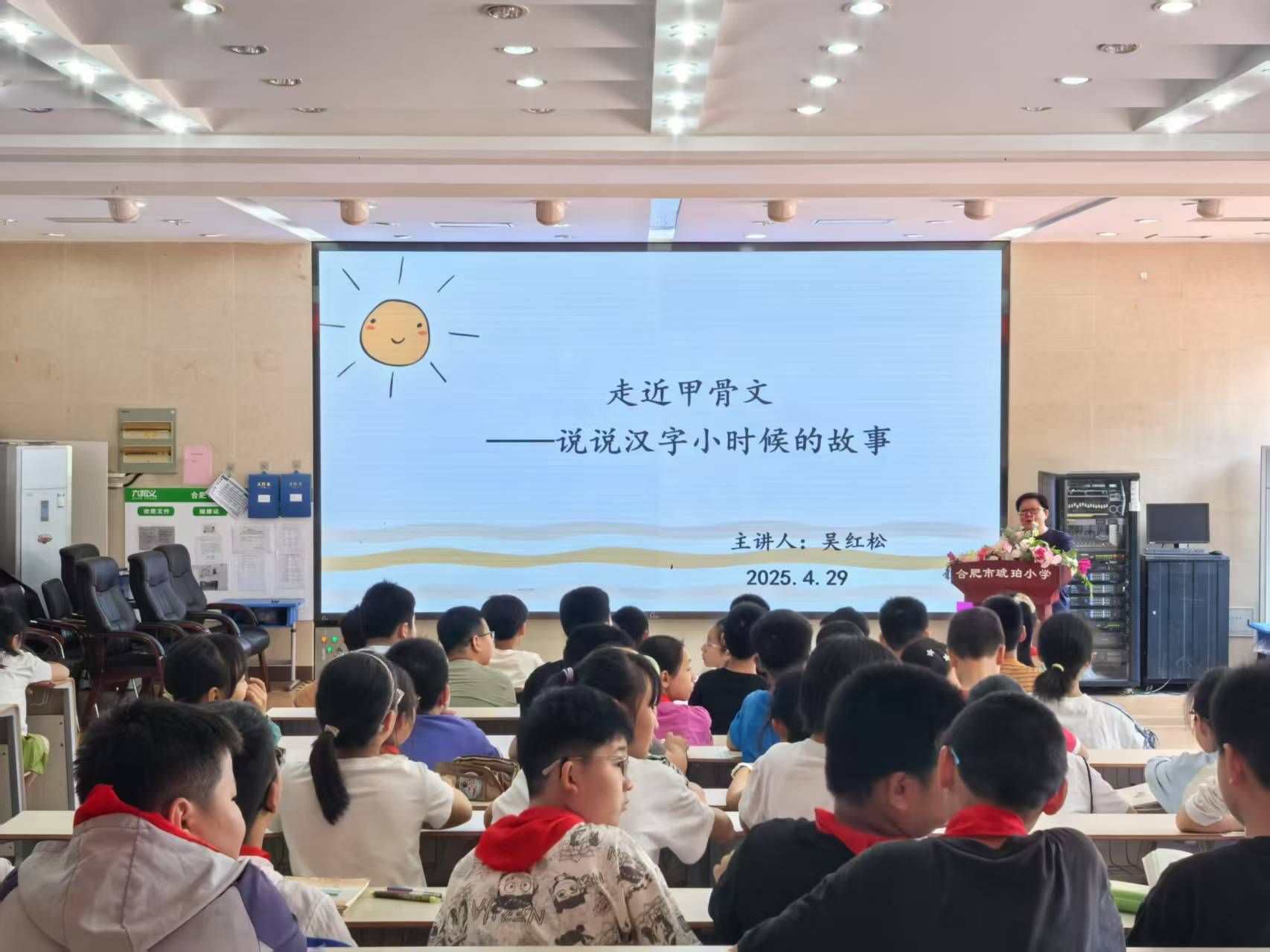 吴红松以《甲骨文的探秘之旅》为题,给孩子们讲授 “汉字小时候的故事”。从汉字的起源、甲骨文的发现与制作过程到汉字形体的演变,以小学生乐于接受的形式深入浅出、娓娓道来,同学们热情高涨,积极参与互动交流。