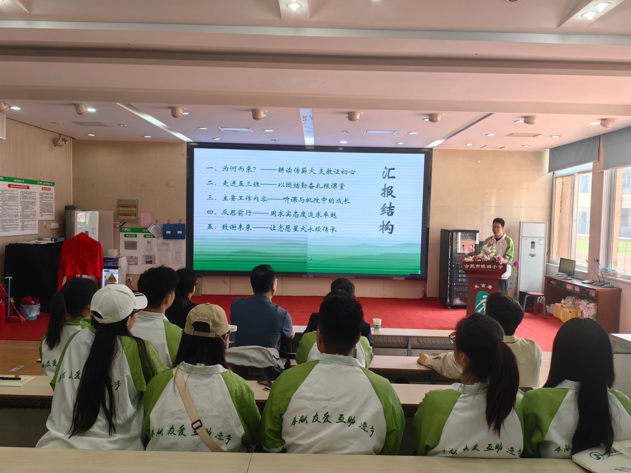汇报会上,第27届研究生支教团成员们通过PPT演示,全面展示实习成果。“短短两周的实习,我们秉持着团结勤奋的精神扎根课堂,积极开展‘四个一’暖心行动,在跟班老师的悉心指导下,我们不仅掌握了教学技能,更领悟了和学生相处的真谛,也总结出了“黄金15分钟”教学法则,带着这段经历所赋予的收获与感动,我们将奔赴远方,把温暖与知识传递给更多需要的孩子。”成员朱鑫源分享。而第25届研支团队长刘俊,时隔一年再次回到琥珀小学,感慨万千:“琥珀小学的实习经历宛如源头活水,滋养着我们的教育教学之路。在支教地面对繁重的教学任务和相对复杂的教学对象时,老师们当年的言传身教助力我们快速完成了从‘青年学子’到‘人民教师’的角色转变。”