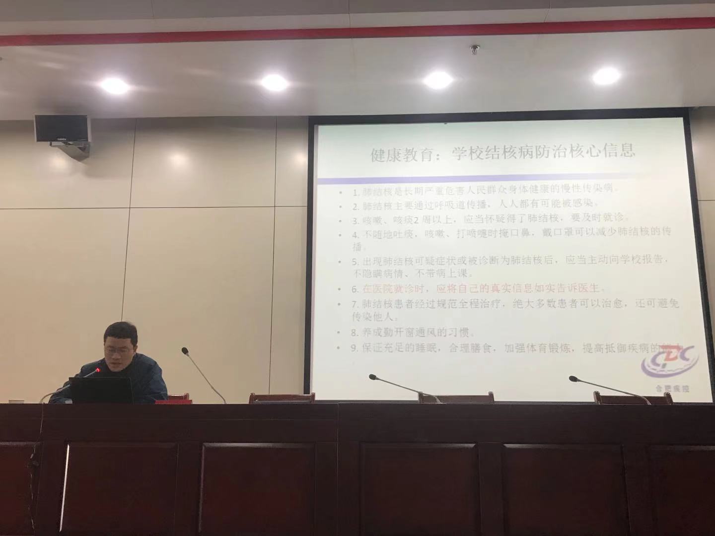 本网讯 2021年3月24日是第26个世界结核病防病宣传日,今年的宣传主题是“消除结核流行,自由健康呼吸”。为了让结核病防治知识家喻户晓,提高我校师生的知晓率,23日上午,校学生处、后勤保障处校医院邀请蜀山区疾控中心结防科专家阚俊岭在图书馆第二报告厅举办了肺结核防治知识专题讲座。