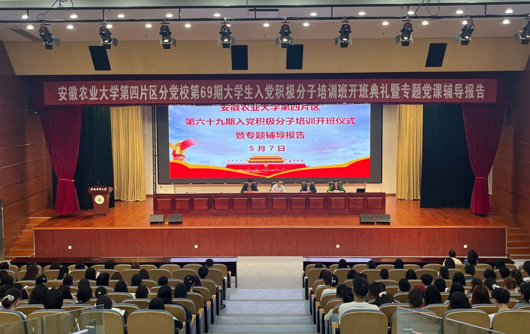 本网讯 5月7日晚,校第四分区分党校第69期入党积极分子培训班开班典礼在图书馆第一报告厅举行。外国语学院党委书记何如海,经济管理学院党委副书记、纪委书记周涛,人文社会科学学院党委副书记、纪委书记孙辉出席,开班典礼由外国语学院党委副书记、纪委书记姬惠惠主持。