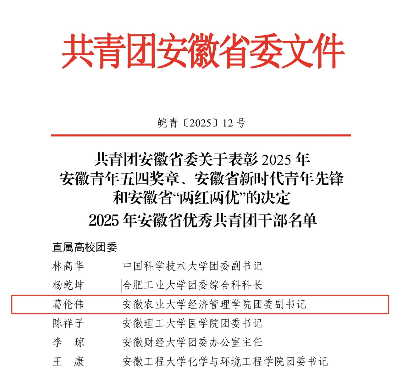 本网讯 近日,共青团安徽省委发布《关于表彰2025年安徽青年五四奖章、安徽省新时代青年先锋和安徽省“两红两优”的决定》。经济管理学院团委副书记葛伦伟荣获“安徽省优秀共青团干部”。