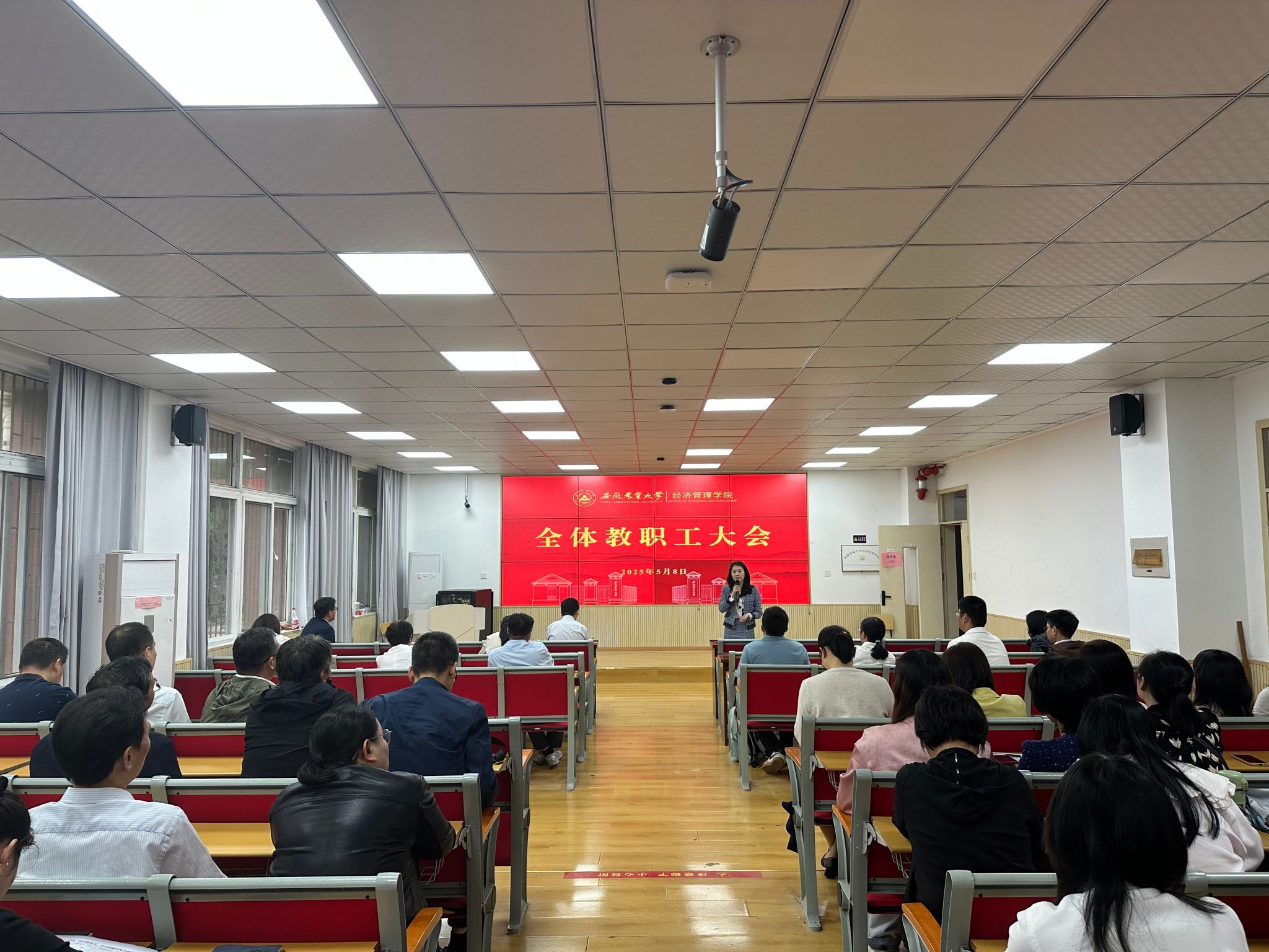本网讯 5月8日下午,经济管理学院在经管楼103会议室召开全体教职工大会,学院领导班子及全体教职工参加会议,会议由学院党委副书记、纪委书记周涛主持。