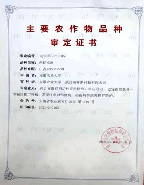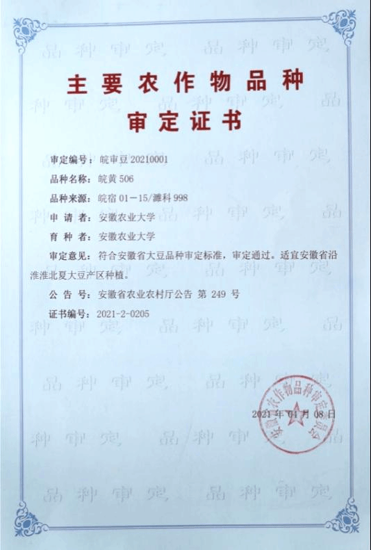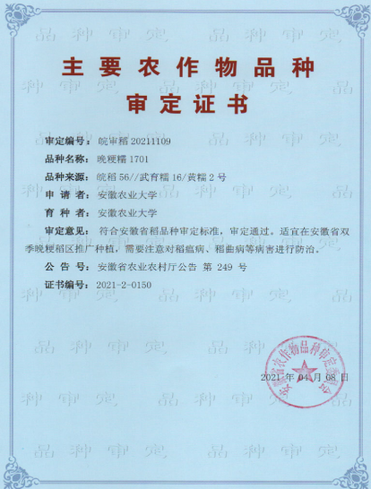 本网讯近期,2021年安徽省主要农作物新品种审定公告已经发布,安徽农业大学农学院喜获丰收,共有5个作物新品种获得审定证书,其中水稻品种2个,小麦品种2个,大豆品种1个。皖粳糯1701和皖黄506新品种的审定填补了我校近二十多年来在粳糯稻和大豆品种的空白,为推动作物学学科全面发展奠定了基础。