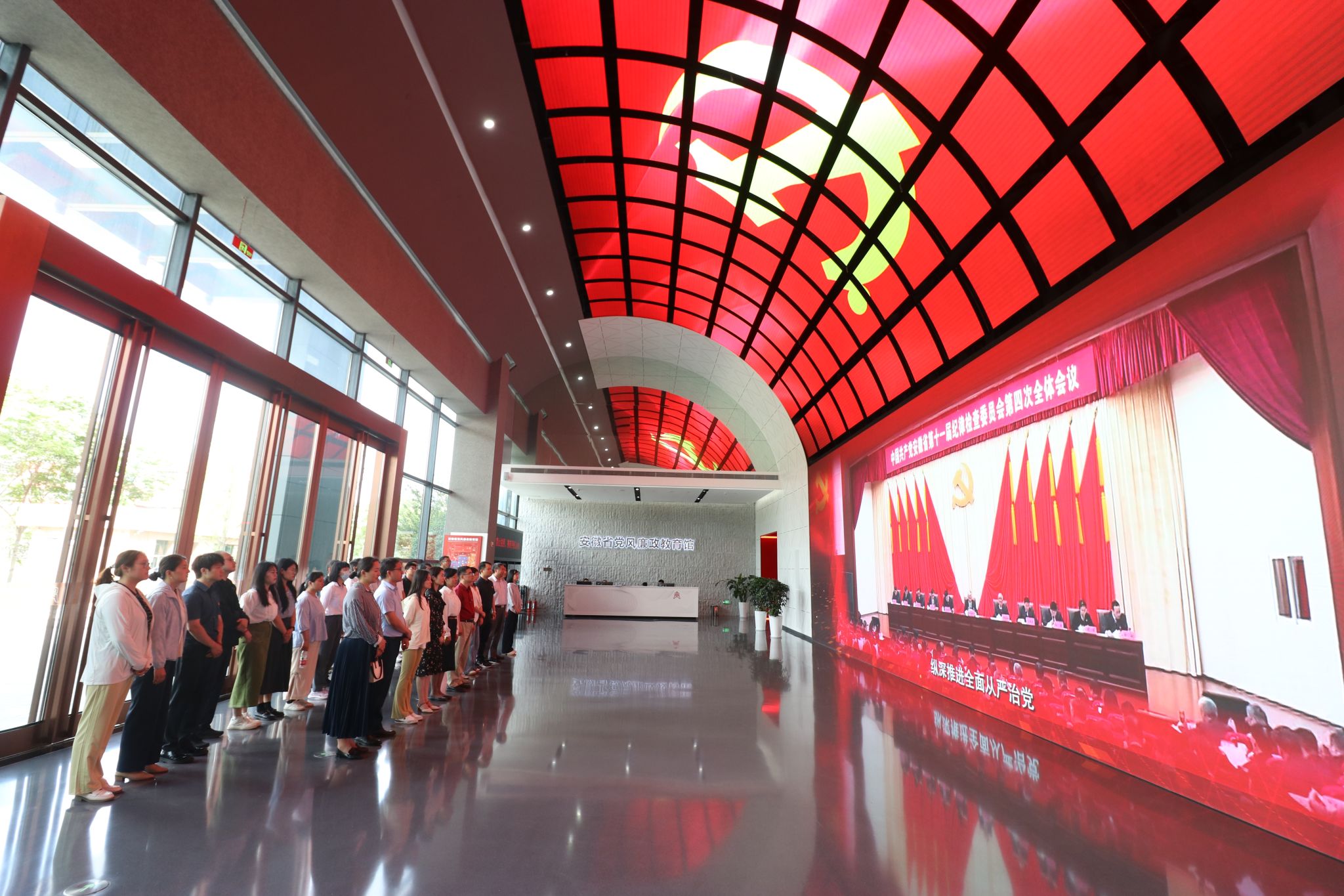 在讲解员的带领下,全体党员干部依次参观了“纪律立党·从严治党”“廉润江淮·清风扬帆”“以案为鉴·警钟长鸣”“不忘初心·永葆清廉”等主题展区。通过参观展板、视频资料、场景还原、空间体验等形式,系统回顾了中国共产党筚路蓝缕的百年纪律建设史,深刻感受到党的十八大以来全面从严治党取得的辉煌成就以及安徽省党风廉政建设和反腐败斗争的工作成效。