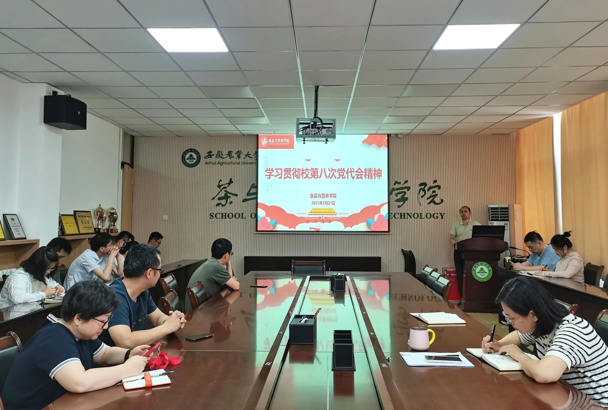 本网讯 5月21日下午,食品与营养学院在茶业楼219会议室召开全体教职工大会,及时学习传达校第八次党代会精神。会议由院党委书记孙福主持,学院领导班子成员及全体教职工参加大会。