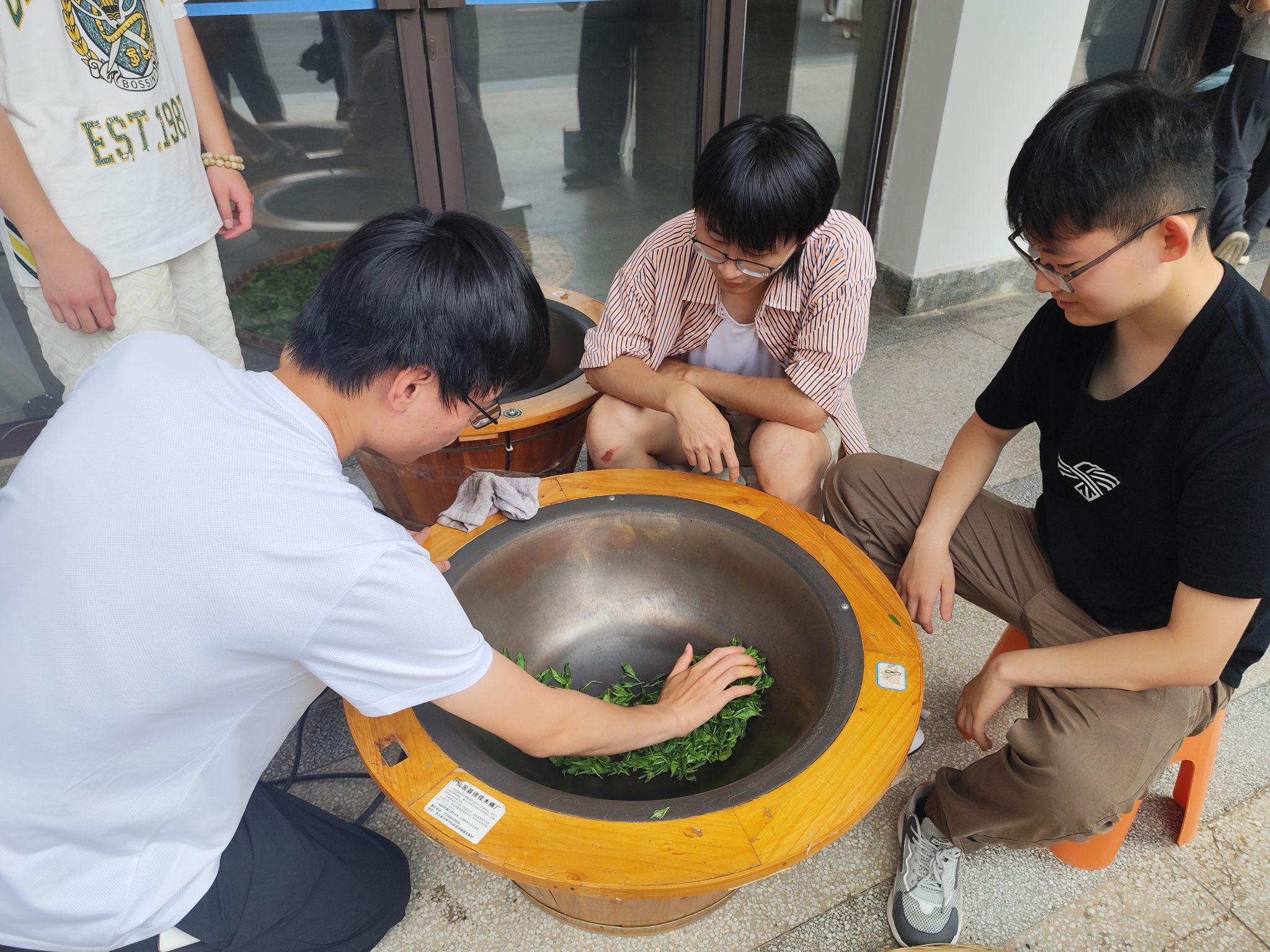 炒龙井茶体验可谓是现场焦点。制茶大师现场演示“青锅”“辉锅”技艺,双手在220℃的铁锅中翻飞,碧色茶青逐渐散发出熟豆香。师生们轮番尝试,尽管动作略显生涩,却在反复翻炒中体悟到“精益求精”的匠人精神。