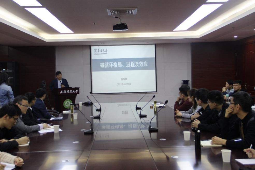 袁增伟教授首先介绍了物质循环及其环境效应,详细介绍了物质循环的多尺度磷循环格局,解释了磷在土壤-水环境中的迁移转化过程机理,同时阐明了含磷废物(污泥、畜禽粪便)资源化技术,最后通过巢湖流域具体案例展示了磷循环生命周期资源环境效应评估;并与广大师生对磷循环的监测技术、巢湖水体磷的富营养化溯源问题、固体废弃物磷资源化利用方面展开了热烈的交流讨论。