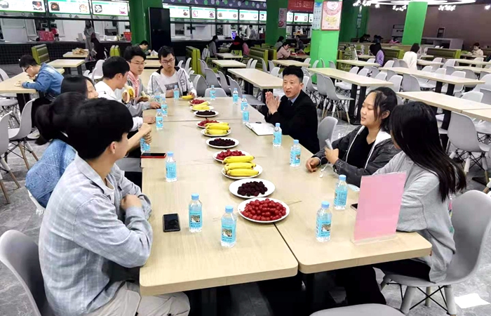 在食堂后厨,学生代表们参观食堂食材进货、验收和“三证”管理过程,以及食材储存、加工、售卖等环节。食堂的经理现场与学生代表们进行面对面交流,聆听学生代表对饭菜价格、饭菜质量、食堂服务等意见和建议,商讨如何让学生吃得安全、吃得健康、吃得满意,并一起共进“霸王餐”。
