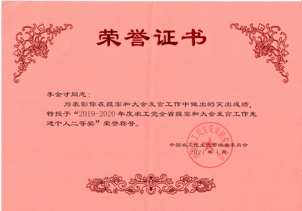 本网讯近日,农工党安徽省委员会对全省各级组织2019-2020年提案和大会发言工作中取得的突出成绩予以表彰。农工党安农大总支主委李金才荣获“先进个人”荣誉称号。