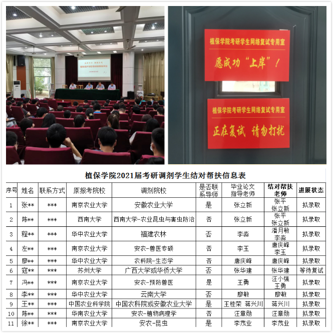 本网讯近日,随着全国硕士研究生招生工作接近尾声,植物保护学院2021届考研毕业生捷报频传,考研成功拟录取学生116人,全院考研录取率高达58.88%,其中2017级植物保护专业60.83%、2017级动植物检疫专业60.53%,录取院校覆盖浙江大学、中国科学技术大学、南开大学、东南大学等众多知名院校,录取率和录取院校层次再创新高。