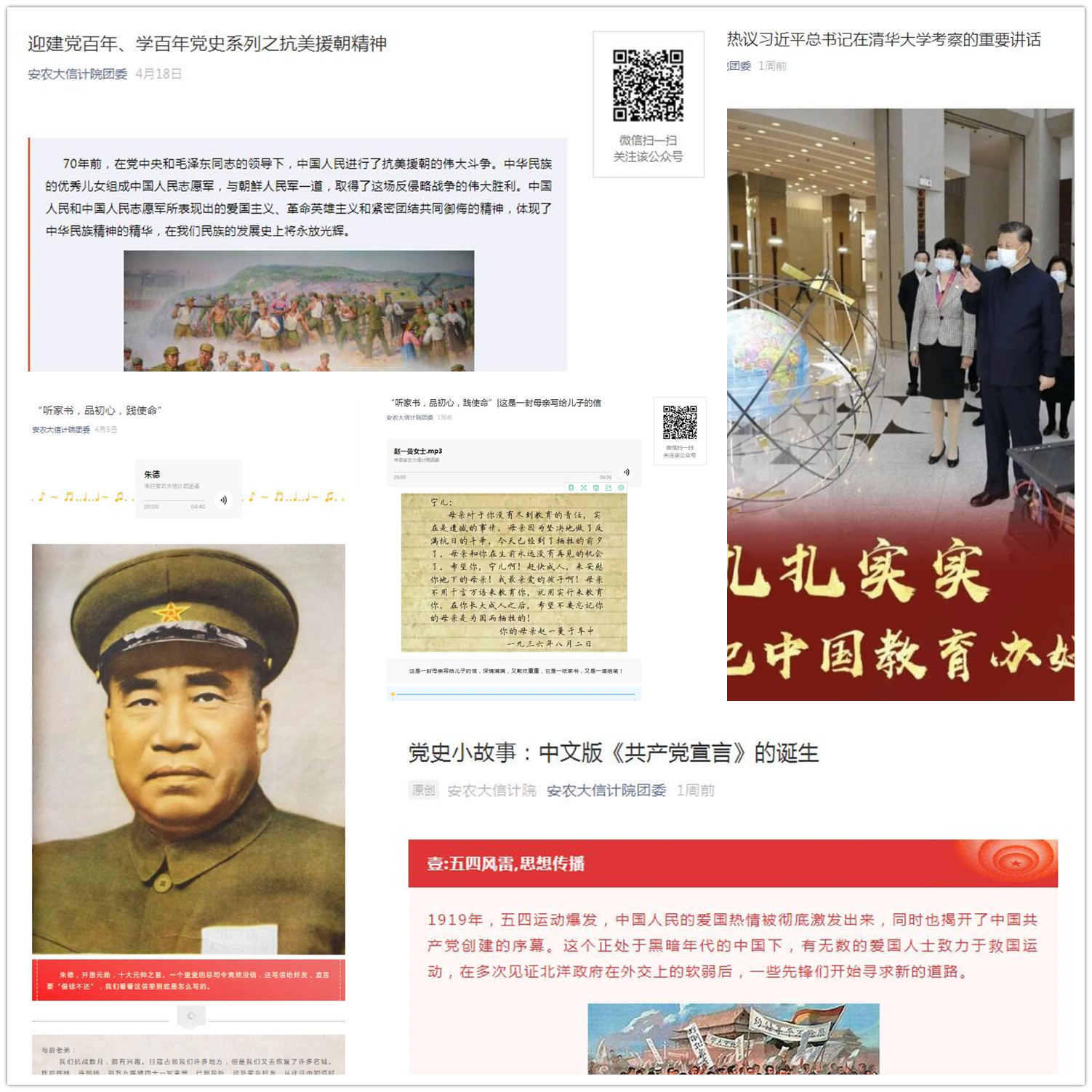 今年是中国共产党成立100周年,学院紧扣党史学习教育主题,精心组织形式多样、贴合青年特点的主题团日活动,教育、引导广大青年努力把党史这门“必修课”学深悟透。学院组织全体师生采取集中与分散、线上与线下相结合的方式,观看了由中央组织部、中央广播电视总台联合录制的《榜样5》专题节目和教育部社科司与人民网联合举办的“同上‘四史’思政大课”,邀请领导干部走进支部进行“伟大精神”宣讲、退休党员“以身示范”开展专题讲座、学生骨干走上讲台“微宣讲”,以青年学子感兴趣的方式把党史学习和思政教育、安全警示教育等内容结合起来,让“遥远”的历史变得可亲可近可学,使广大青年学子牢记习近平总书记的殷切嘱托“立大志、明大德、成大才、担大任”,努力成为堪当民族复兴重任的时代新人,让青春在为祖国、为民族、为人民、为人类的不懈奋斗中绽放绚丽之花。