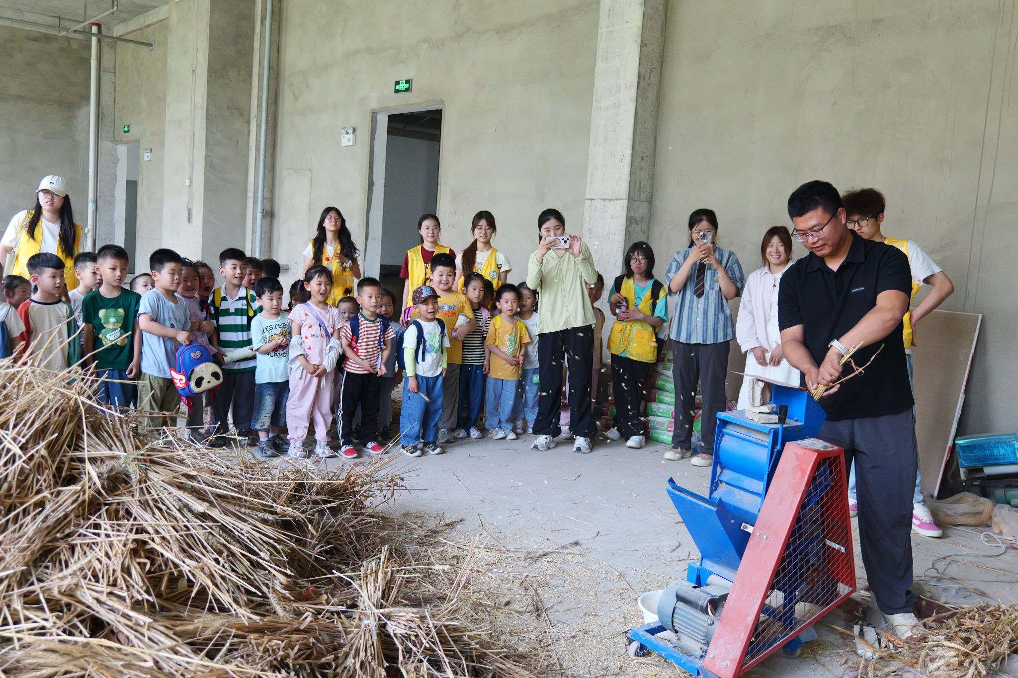 2025 年 6 月 4 日下午,朝阳楼一楼,脱粒机的轰鸣声中,金黄的麦粒如瀑倾泻;当幼儿园小水田泛起嫩绿的涟漪,小朋友们稚嫩的小手正将秧苗轻轻插入泥土,安徽农业大学农学院第23期“耕读童行”志愿活动在这充满生机的场景中火热启幕。幼儿园中班和小班的小朋友们在不同场地同时开启农耕文化探索之旅,于实践中感受传统农业的魅力与劳动的乐趣。