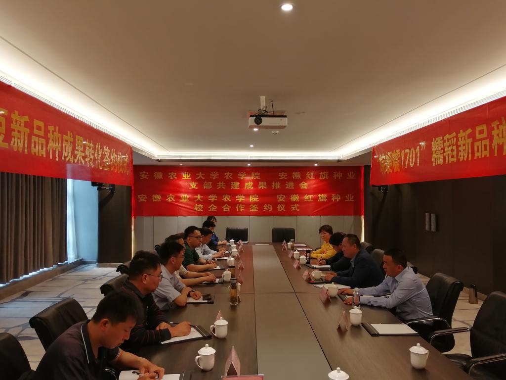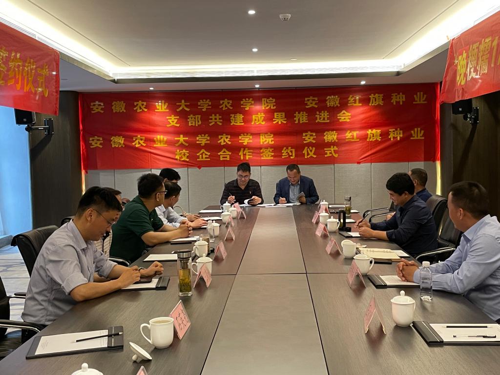 随后,双方进行了支部共建成果推进会并深入座谈。贾长敬总经理首先介绍了公司近期的重要进展。他表示,红旗种业在发展的道路上一直非常重视科研投入,希望未来通过深化校企支部共打造完整“科研产业链”,为乡村振兴贡献力量。管志权书记对安徽红旗种业的热情接待表示感谢,并从校企支部共建的组织形式、社会职能、未来发展等方面进行了发言,强调支部共建的核心在于政治建设,落脚点在于促进事业的发展,指出未来校企要深度融合的发展方向。教工第二党支部书记王晓波回顾了自2018年正式签署支部共建协议以来,红旗种业对我院大豆、水稻等新品种培育的支持和贡献,并希望通过此次活动推进共建常态化,为十四五“开新局,谋新篇”打下基础。会议总结了支部共建三年来的重要成果,包括淠东乡鲜食大豆项目、糯稻新品种成果转化项目、大豆新品种成果转化、大豆专利技术转化及共建安徽优质大豆产业联盟项目等。