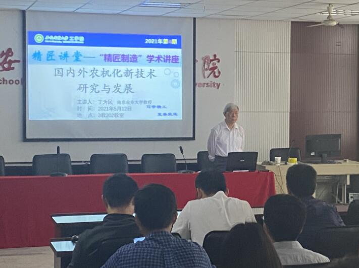 本网讯5月12日下午,南京农业大学丁为民教授应邀做客工学院精匠讲堂——“精匠制造”学术讲座第4期,在三教202学术报告厅为我院师生作题为《国内外农机化新技术研究与发展》的学术报告。报告会由院长陈黎卿主持。