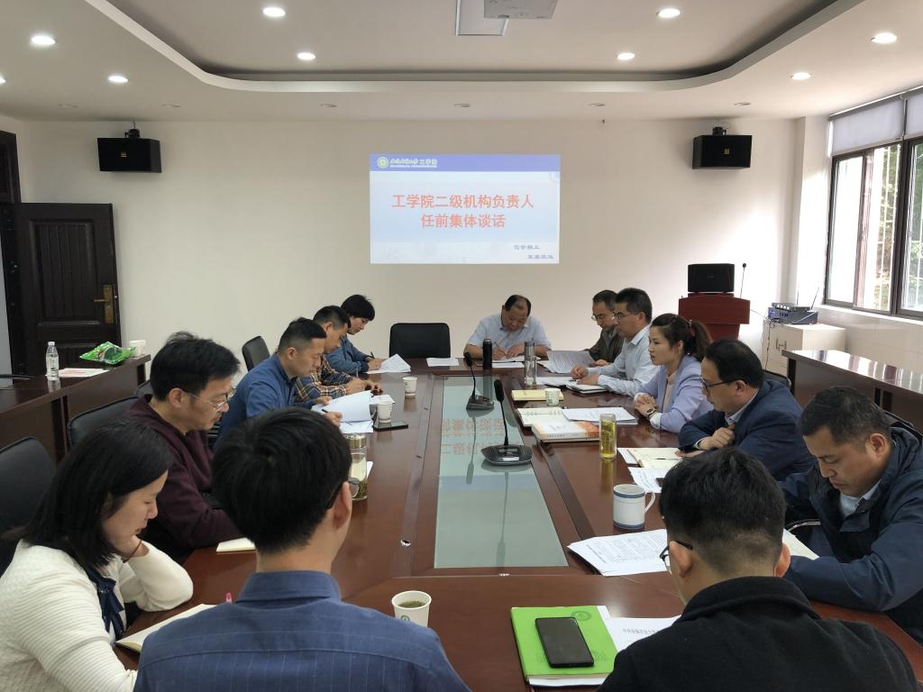 本网讯5月17日,工学院在学院会议室召开新聘二级机构负责人任前集体谈话会。学院班子成员及新聘二级机构负责人参会,会议由院党委书记任琪主持。