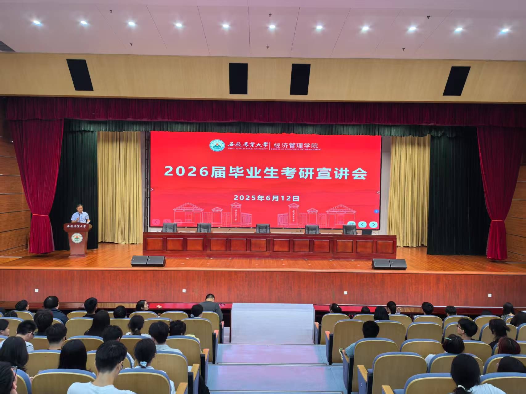 本网讯 6月12日晚,经济管理学院在图书馆第一报告厅举办 2026 届毕业生考研宣讲会。校研究生学院副院长姚辰松、学院党委书记武晓蓓、学院副院长李坦、各系主任、2021 级考研学生代表、2022 级考研学生及辅导员参加宣讲会。宣讲会由学院党委副书记周涛主持。