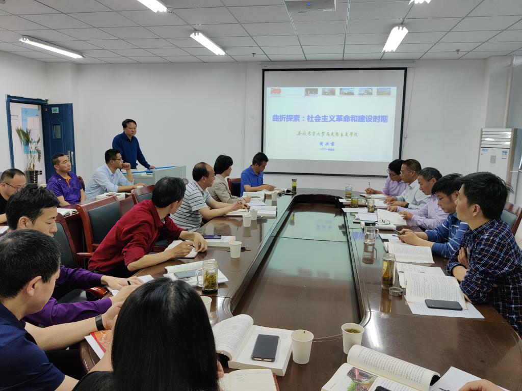 本网讯 5月21日下午,理学院在院会议室召开党委理论中心组(扩大)学习会暨“学史增信”专题学习研讨, 会议以“研讨+宣讲”的形式开展,马克思主义学院党总支书记、院长黄洪雷教授以“曲折探索:社会主义革命和建设时期”为题,为全体参会人员做了“社会主义革命和建设时期历史”宣讲。院党委书记王冬平主持会议,院党委中心组成员参加了会议。