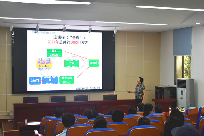 在报告厅,郑红梅教授为拟申报课程的老师们详细解读了教育部一流课程实施意见,以及教育部2021年一流本科课程申报要求。培训全面介绍了现阶段五类“金课”的建设要求,详细阐述了各类课程建设的核心要素和建设标准。从申报文本撰写、说课视频录制、教学内容设计、支撑材料筹备等多个方面分享了国家级一流本科课程的申报体会;从团队建设、课程理念、课程实施、课程创新等多个维度总结了一流课程的建设经验。