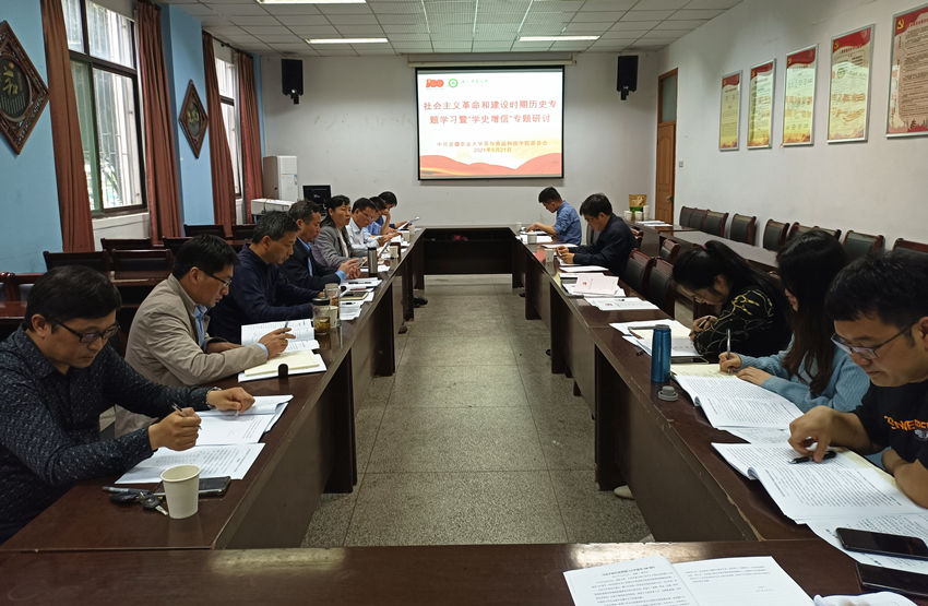 本网讯5月21日下午,茶与食品科技学院在茶业楼105会议室开展社会主义革命与建设时期历史专题学习暨“学史增信”专题研讨。院党委书记唐红萍主持会议,院党委理论中心组成员、各党支部书记参加学习研讨。