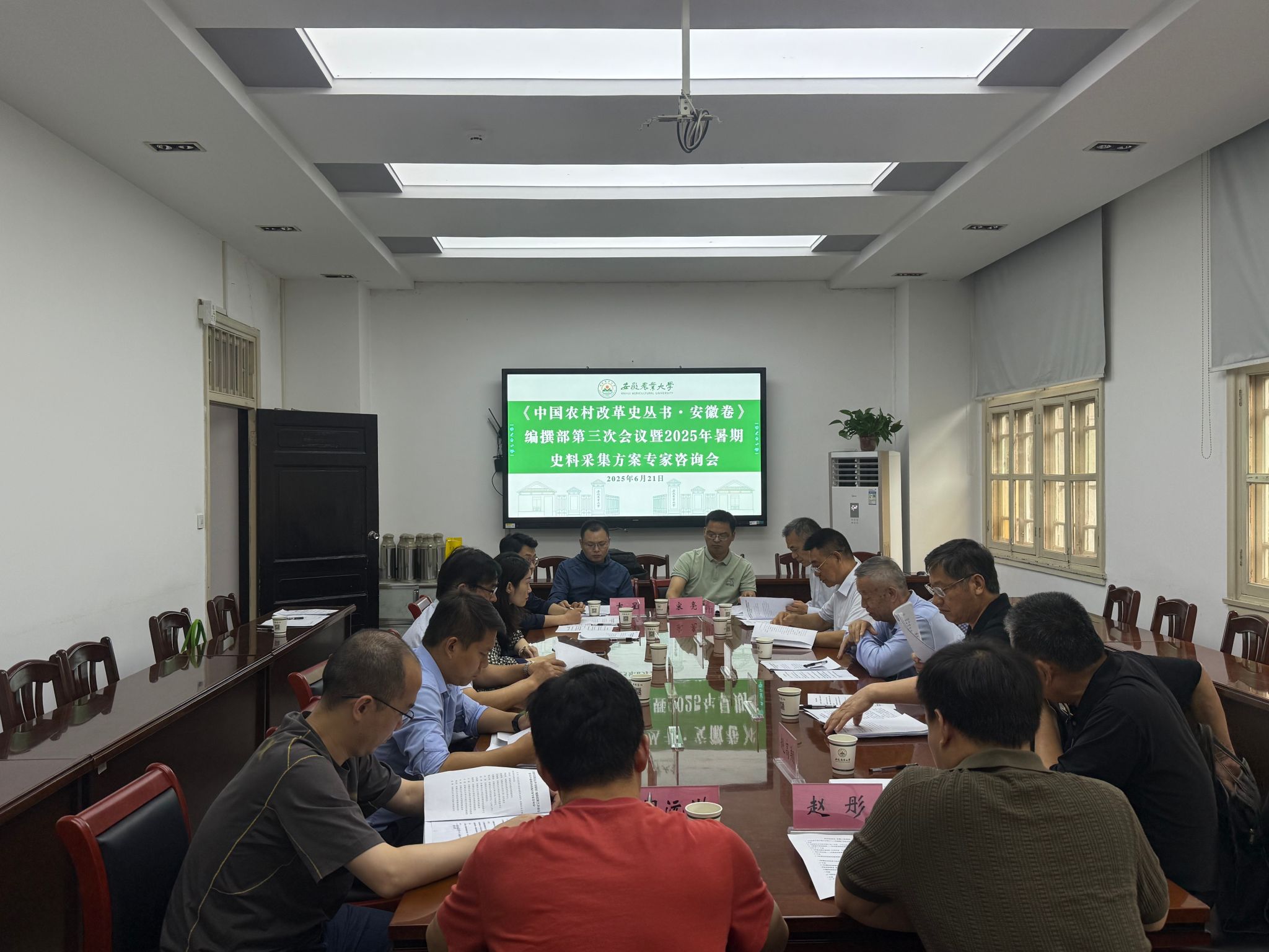 本网讯 6月21日,“十四五”国家重点出版规划项目《中国农村改革史丛书・安徽卷》编辑部在勤政楼第一会议室组织召开第三次会议暨2025年暑期史料采集方案专家咨询会,研究部署《安徽卷》编撰下一阶段重点任务。农业农村部专家咨询委员会委员、安徽农业大学乡村振兴智库首席专家刘奇,省乡村振兴局原副局长阳传炉,省农业经济学会原会长胡桂芳,省农业农村厅原二级巡视员赵高翔等领导专家,学校团委和经济管理学院有关负责人,编辑部成员参加会议。会议由乡村振兴学院院长刘鹏凌主持。