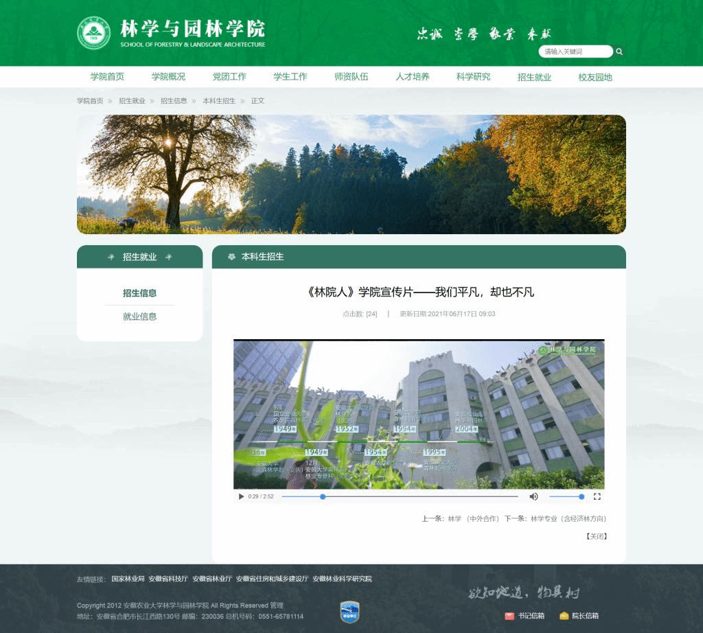 学院宣传视频之《“林院人”——我们平凡 却也不凡》,是以学生为主角,经过近半年的团队策划、文案设计、角色培训、精心拍摄,于2021年6月9日震撼上线。宣传片以“我们都是林院人”为主线,突出学院历史、凝练专业内涵,聚焦名师授课、传递师生大爱、展现校友风采。短短3分钟,多视角、多层次、多维度的镜头切换,情景交融,虚实结合,让人深切感受“忠诚 崇学 敬业 奉献”的林院精神。(《“林院人”——我们平凡 却也不凡》http://lxyyl.ahau.edu.cn/info/1102/4459.htm)