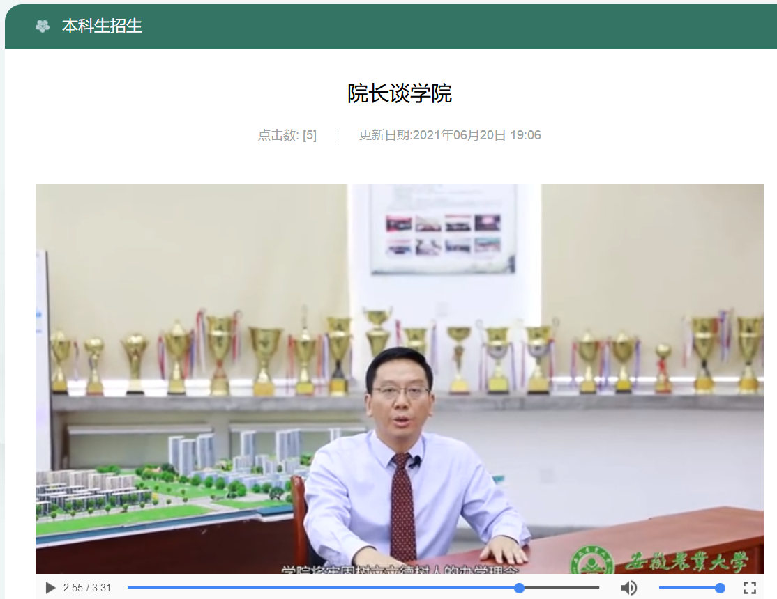 学院宣传视频之《院长谈学院》,是从院长角度出发,谈学科发展、谈平台建设、谈专业特色、谈培养理念等,向考生和家长深入分析学院发展现状和未来。(《院长谈学院》网址http://lxyyl.ahau.edu.cn/info/1102/4493.htm)