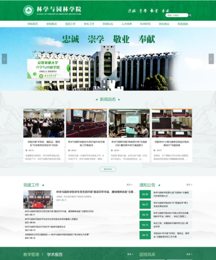 为进一步发挥学院网站功能,展示形象,传递资讯,提高网页的实用性、功能性、美观性,提升网站的安全和便捷,推进学校信息化建设,学院根据校《关于开展第六届网站建设评比活动的通知》要求,结合学院工作实际,经办公室近三个月的筹备、设计,经学院党政联席会议多轮研究论证,完成了对学院网站的全新改版和测试工作,并于2021年6月6日(高考日)上线运行。网页首页增设招生宣传滚动图片链接,方便访问者一键了解招生宣传信息。(林学与园林学院网址:http://lxyyl.ahau.edu.cn/)