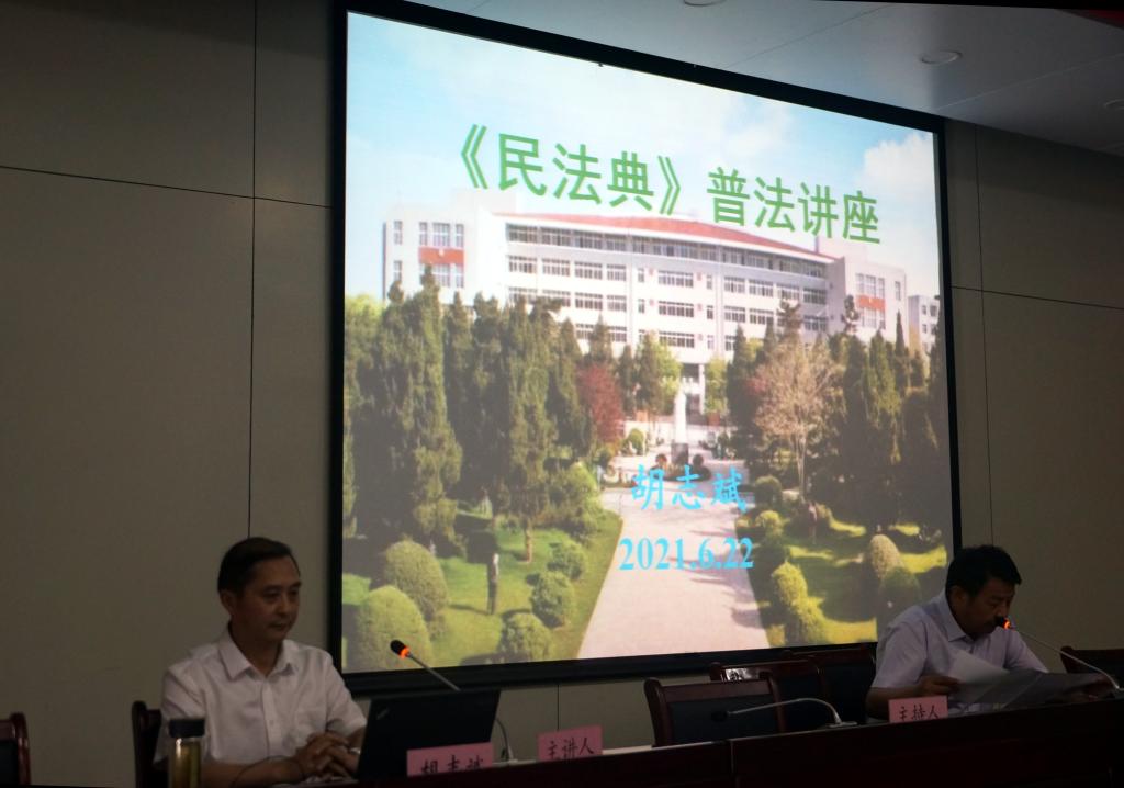 本网讯6月22日下午,我校在图书馆第二报告厅举办《中华人民共和国民法典》(以下简称“《民法典》”)专题普法讲座,我校人文社会科学学院胡志斌教授担任主讲,各部门工会委员和师生代表在现场聆听了讲座,校工会副主席宋齐主持了此活动。