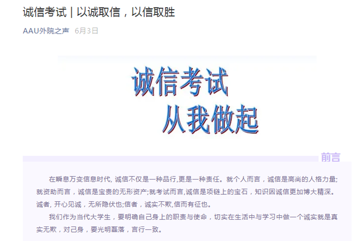 拓展新媒体宣传途径。学院在易班和微信公众号分别上线诚信主题教育和安全教育宣传专栏,推出《以诚取信,以信取胜》等优质宣传内容,涉及学生诚信教育、预防诈骗教育,远离不良贷、套路贷警示教育、人身安全教育等,在广大青年学生中普及征信知识、金融知识和安全知识,引导他们珍爱信用、理性借贷消费,提高他们的征信意识、法律意识和安全意识。