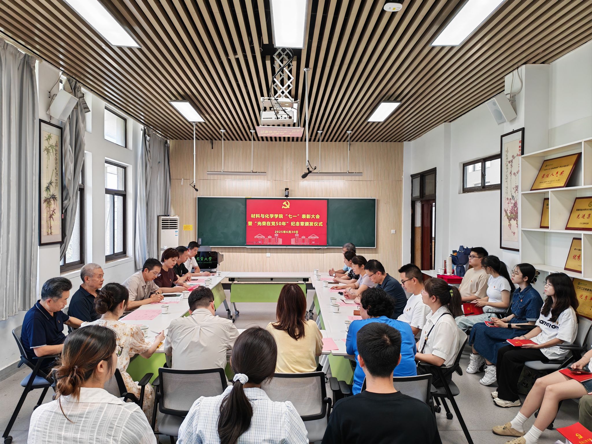 本网讯 6月30日下午,材料与化学学院在402会议室隆重举行“七一”表彰暨“光荣在党50年”纪念章颁发仪式,学院领导班子、各党支部书记、学生党员代表参加会议,大会由学院党委副书记周晓娟主持。