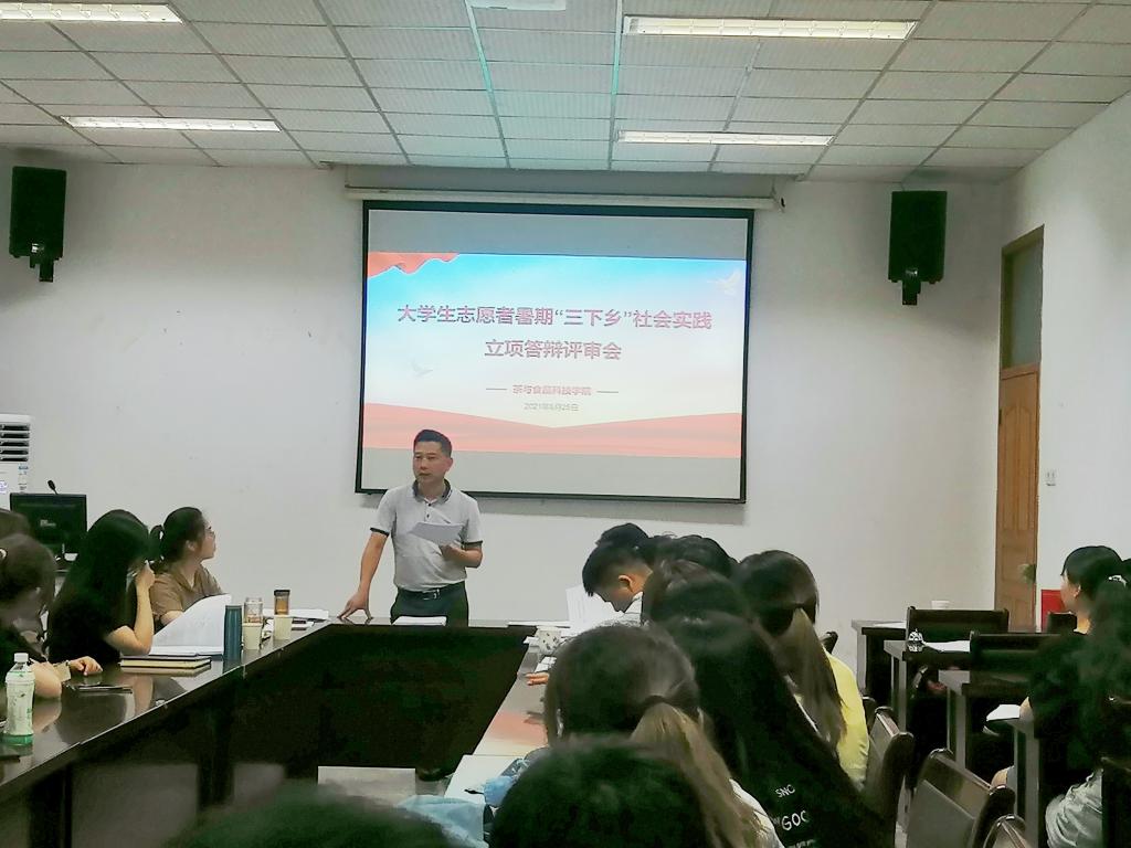 本网讯6月25日,茶与食品科技学院2021年度暑期“三下乡”社会实践团队立项答辩评审会在茶业楼105会议室举行。学院党委副书记夏业鲍、食品营养与安全系副教授彭传燚、学院挂职团委副书记余振宇、专职辅导员等参加此次会议。会议由学院团委老师主持。