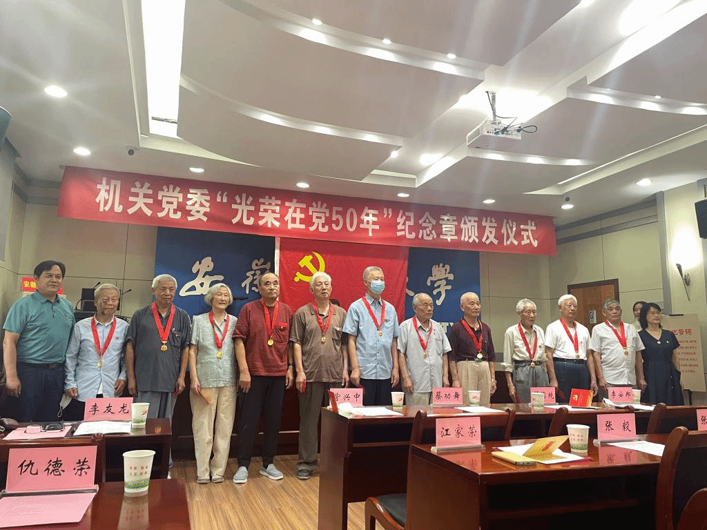 刘凯代表机关党委作了致辞。他说,“莫道桑榆晚,为霞尚满天”,“各位老领导、老党员都是我们党的历史、新中国发展史和安农进步成长史的亲历者、参与者、见证者和开拓者,是党、国家和我们学校的宝贵财富,是推动新时代教育事业高质量发展的重要力量。今年是“十四五”开局之年,恰逢建党一百周年,宏伟的目标总是在砥砺笃行中实现,学校的高质量发展需要我们老党员献智献策,学校的深化改革需要老领导、老党员的“鼓与呼”,希望老领导、老同志们继续关心支持学校事业发展,讲好忠诚故事、讲好安农故事,传授革命传统、传递安农声音,多用亲身经历和厚重历史教育年轻干部,建言学校发展。多以言传身教,赓续精神血脉、激发奋进动力,推动机关作风正气充盈、健康向上。同时希望机关党委的各党支部和全体党员干部务必要深入学习贯彻习近平新时代中国特色社会主义思想,进一步扎实抓好党史学习教育,从“光荣在党50年”纪念章颁发活动中感悟初心召唤、坚定使命追求,将老党员一生忠诚于党、一生服务人民、一生奉献事业的宝贵精神融入血脉、化为行动,为学校高水平大学建设积蓄智慧和贡献力量。”