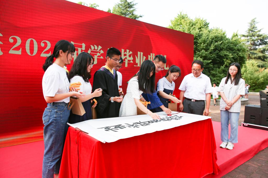 一枚印章话传承。学院今年首次为全体毕业生制作了毕业伴手礼——镌刻有校徽、院名和工学精神的姓名印章,并在毕业典礼中以充满仪式感的方式呈现出来。在典礼的传承篇章,院长陈黎卿亲手将印章礼袋交到学生代表手中,并带领大家在写有“工学院2021届毕业生”字样的宣纸卷轴上盖上了独特的“工学印记”,这带有一枚枚红色印章的卷轴,学院将会永久珍藏。