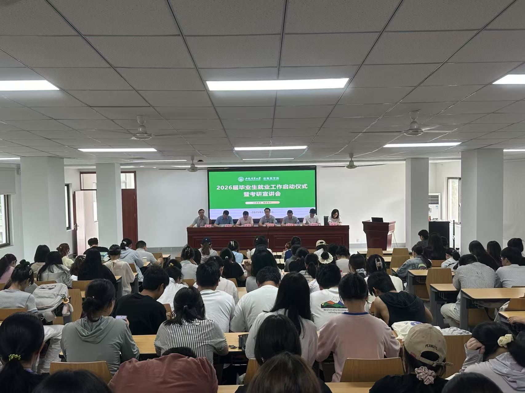 本网讯 6月25日,动物医学院在学院318教室举办2026届毕业生就业工作启动仪式暨考研宣讲会,学生处负责人,学院领导班子,各系主任,辅导员,2026届全体本科生、研究生代表,2022级本科生代表共160余人参会。会议由学院党委副书记张锐主持。