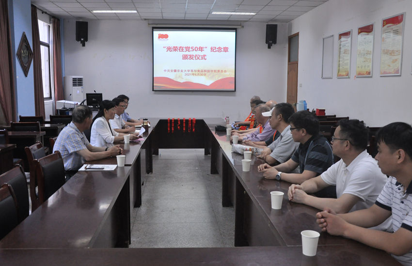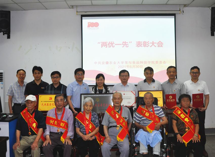 本网讯6月30日下午,在迎来中国共产党百年华诞之际,茶与食品科技学院举行“光荣在党50年”纪念章颁发仪式暨“两优一先”表彰会,院党委书记唐红萍主持会议,党委副书记、院长李大祥,副院长沈周高,“光荣在党50年”的老党员,2021年“两优一先”表彰对象、退休教工党支部李立祥老师参加会议。