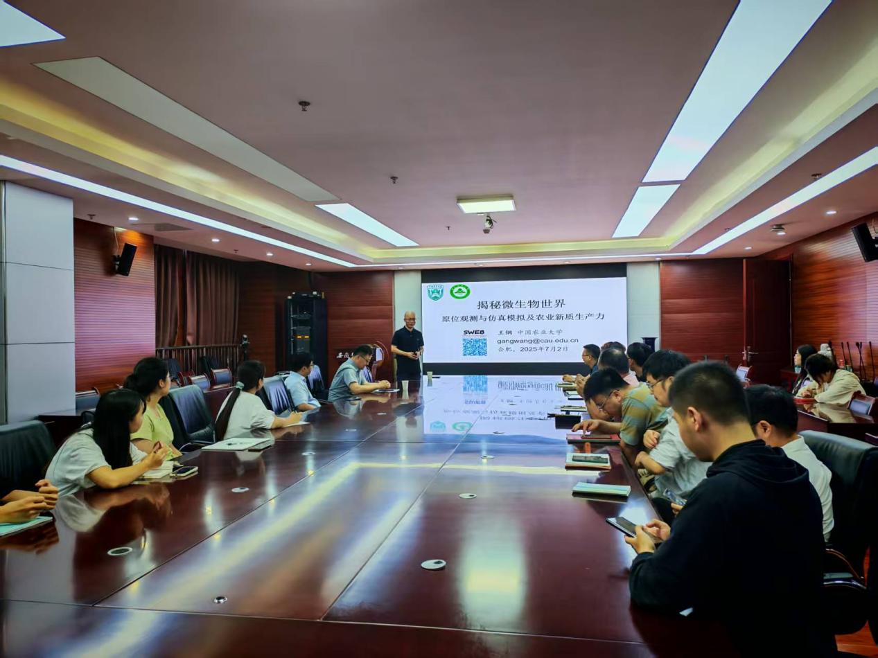 王钢教授作题为《揭秘微生物世界—原位观测与仿真模拟及微生物农业新质生产力》的报告。报告围绕土壤空间结构,水分分布如何影响微生物生长与互作等内容展开,系统探究了计算机仿真和原位观测方法在细菌、真菌、病毒等互作上的应用,为土壤微生物群落结构研究提供了新思路。