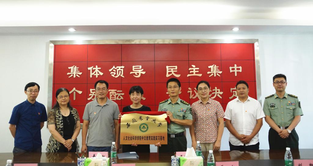 本网讯 为进一步强化大学生的实践能力和创新精神,丰富党史学习教育实践载体,近日,人文社会科学学院汉语言文学专业实习基地在安徽省军区合肥第四离职干部休养所揭牌。人文社会科学学院院长姜红、党委学工部(处)副处长刘柳、党委副书记吴永红、副院长滕瀚与干休四所政委王前龙共同出席了此次揭牌仪式。