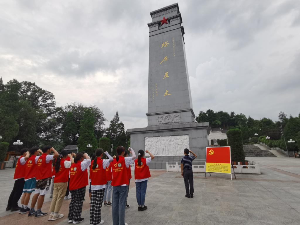 感悟红军精神,建党百年忆初心。7月21日,实践团成员来到金寨县红军广场,瞻仰革命烈士纪念塔,参观金寨县革命博物馆和红军纪念堂。一张张历史照片,一段段文字资料,一件件历史文物,同学们真切的看到了红军战士浴血奋战,同仇敌忾的画面,感受了新中国开创者的艰辛和无畏。在巍峨的革命烈士纪念塔下,面对鲜艳的中国共产党党旗,在夏业鲍的领誓下,实践团师生党员举起右拳,郑重宣誓,铮铮誓言久久回荡。