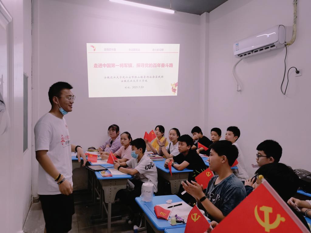 7月20日上午8点,实践团为当地学生一起共同温故了一节党史课。同学们介绍了党的百年历程关键节点以及六霍起义;重点讲述了红船、西柏坡、井冈山等具有代表性的历史故事。在课堂上,当地同学与队员们一起聆听党的百年历程中的英雄事迹、红色故事,从百年党史中感悟初心使命,在寻找红色记忆里感受党的红色精神伟力,传承弘扬大别山精神。