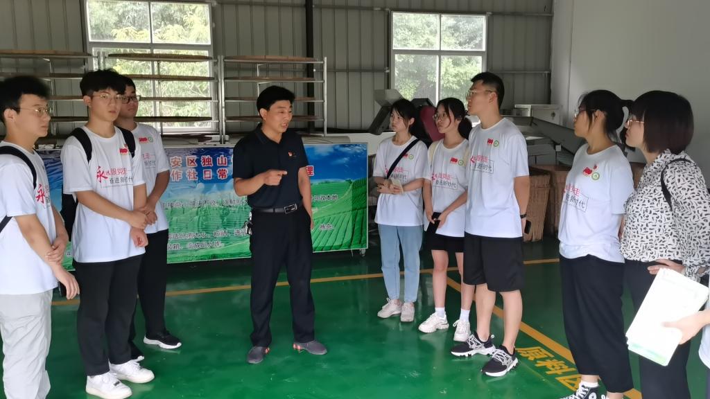 在独山镇游芳冲村,团队成员和指导老师在村支书带领下,一起参加了游芳冲村集体经济发展座谈会。村支书何云圣详细为团队介绍了游芳冲村集体经济发展的艰辛历程及游芳冲村后续的发展方向。“学成要归来,要回到基层去工作。”他笑着鼓舞队员们,“基层工作有酸有苦有累,但更有甜!”会后村支书又带领成员一起前往游芳冲村村集体茶厂学习实践,实地感受乡村振兴的兴盛发展。