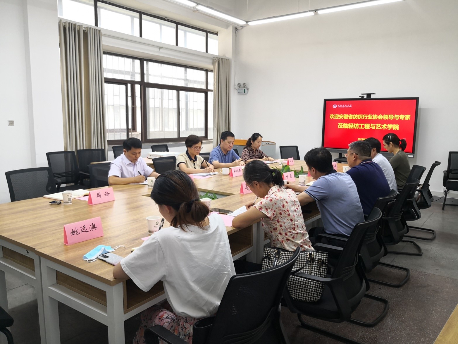 本网讯 8月18日下午,安徽省纺织行业协会执行会长叶梁、副会长陈洁庚,专家委员主任严立鸣一行6人来我院调研,学院院长杜兆芳、副院长王健代表学院热情接待了叶梁会长一行。双方在学院三楼会议室举行了座谈会。杜兆芳院长代表学院对安徽省纺织行业协会领导、专家一行的到来表示欢迎,并向来访客人介绍了学院的建设发展历程、招生规模、人才培养、社会服务及成果等情况。王健副院长向客人详细介绍了学院的科学研究和学科建设情况等。