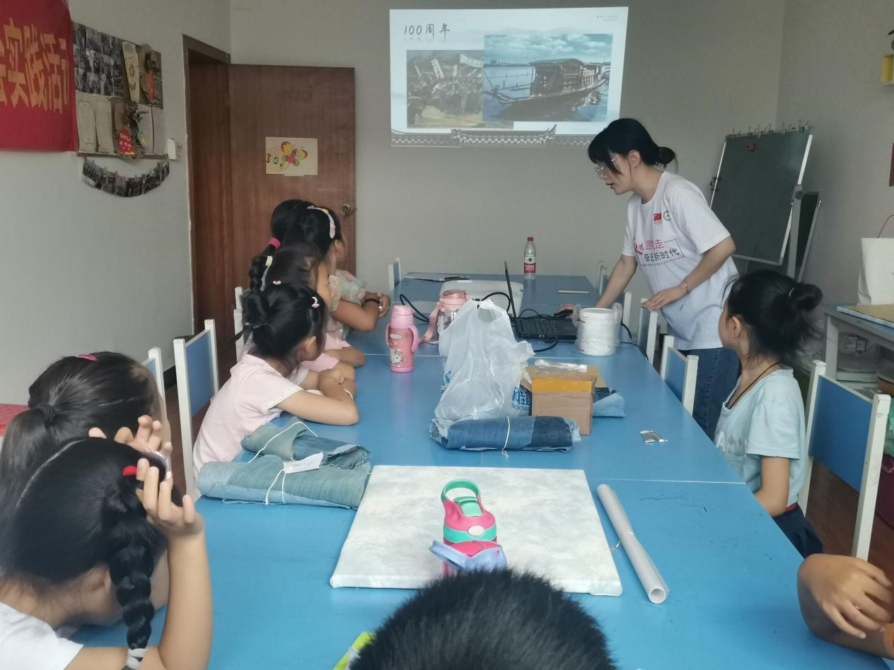 在合肥市龙王社区、陈村路社区、五里拐社区,社会实践团的各位同学们向社区流动儿童们讲述百年党史辉煌历程,并以此为创作基础引导小朋友们利用废旧布艺,开展“拼布”艺术创作。