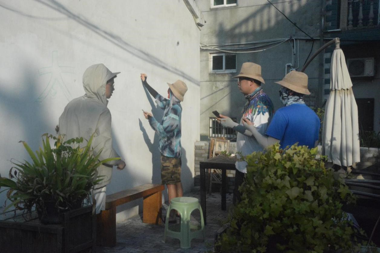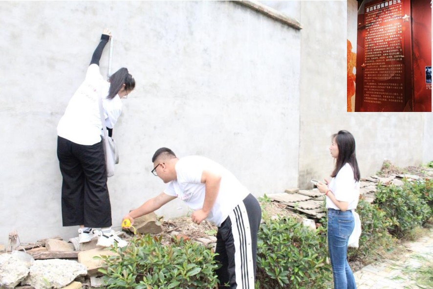 图为墙绘团队同学对小涧镇新四军四师师部旧址墙面进行考察和测量。