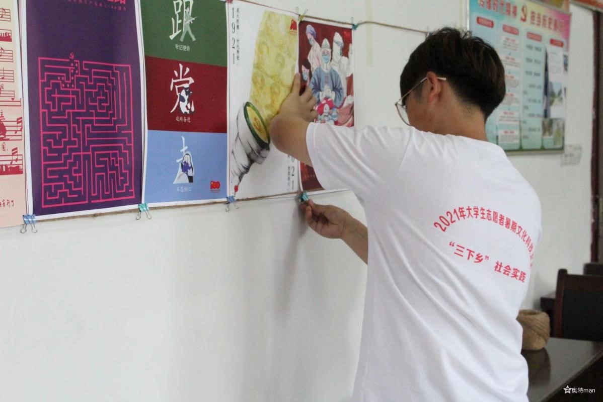 图为实践队员在在蒙城县小涧镇布置党史宣传栏。