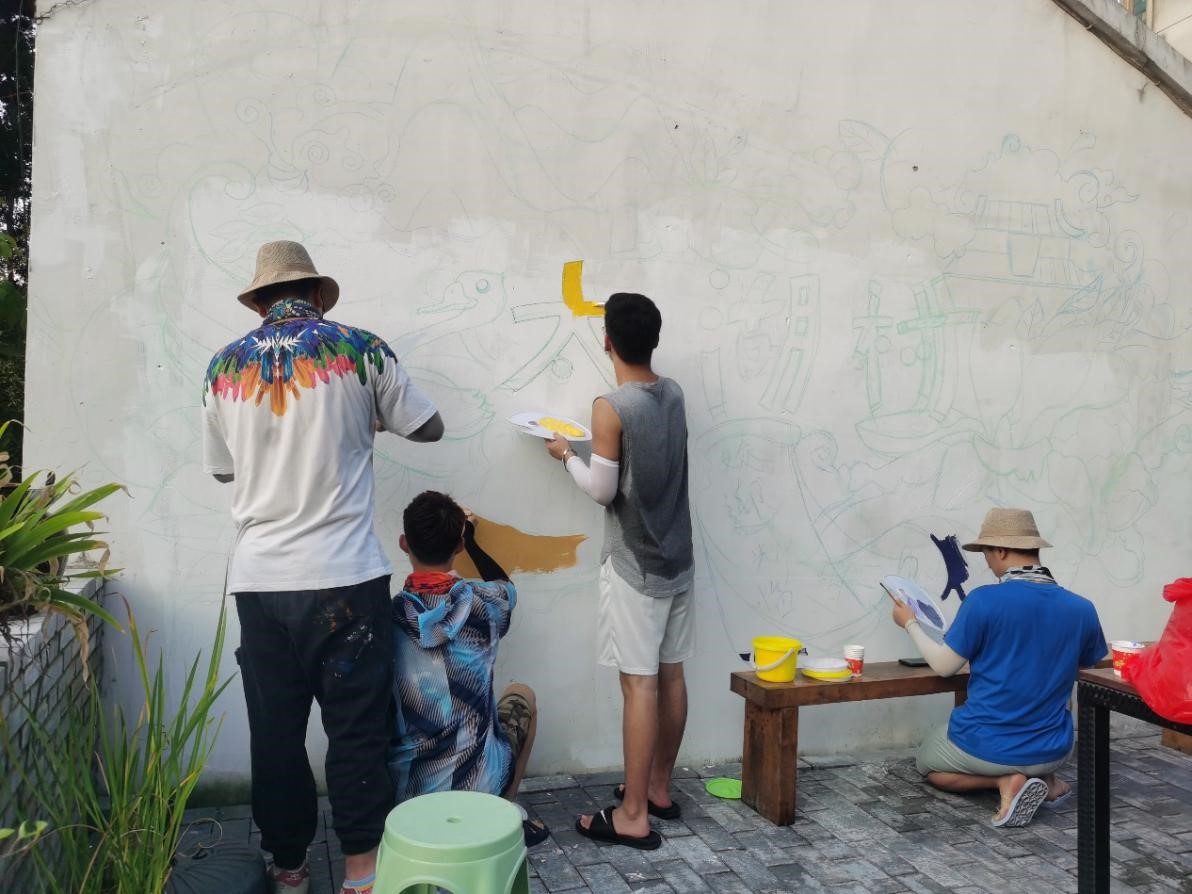 图为同学们在高温天气下对已经画完的墙面图案进行上色。